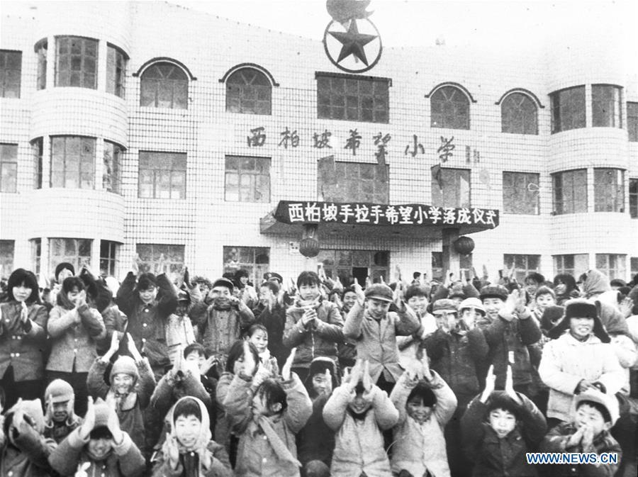 People celebrate during the launching ceremony of "hands in hands" Hope Primary School, which was built with children's donation nationwide by using their lunar new year gift money, in Xibaipo Village of Pingshan County, north China's Hebei Province, Dec. 24, 1993. Project Hope, a Chinese program aiming at financing education for poverty-stricken students, celebrates its 30th anniversary on Oct. 30, 2019. The project was initiated by the China Youth Development Foundation (CYDF) and the Central Committee of the Communist Youth League of China in 1989, and has been supported by people from all walks of life since its establishment. As of September in 2019, Project Hope has received 15.23 billion yuan (about 2.16 billion U.S. dollars) in donations and aided over 5.99 million students in financial difficulty. A total of 20,195 primary schools were also built, according to the CYDF statistics. (Photo by Zhang Zhigang/Xinhua)