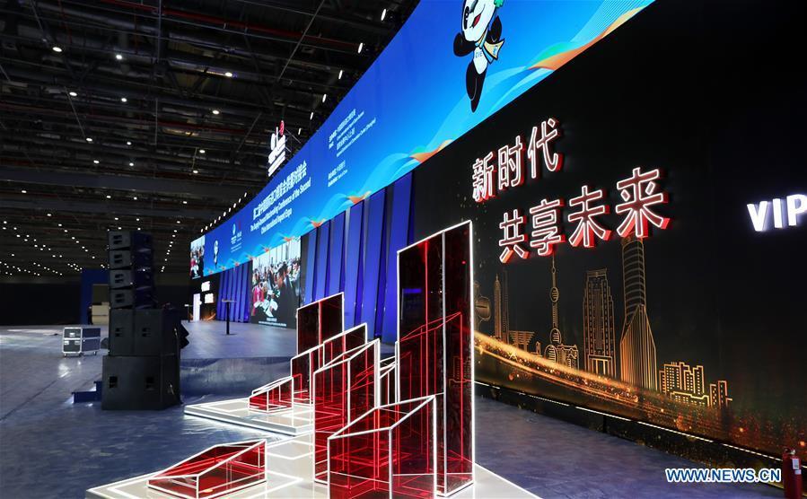 Photo taken on Oct. 31, 2019 shows the conference area of the Supply-Demand Matchmaking Conference of the second China International Import Expo (CIIE) at the National Exhibition and Convention Center in Shanghai, east China. The venue for the Supply-Demand Matchmaking Conference and Media Center of the CIIE have almost been completed and ready to supply service to reporters and participants of the expo. (Xinhua/Fang Zhe)