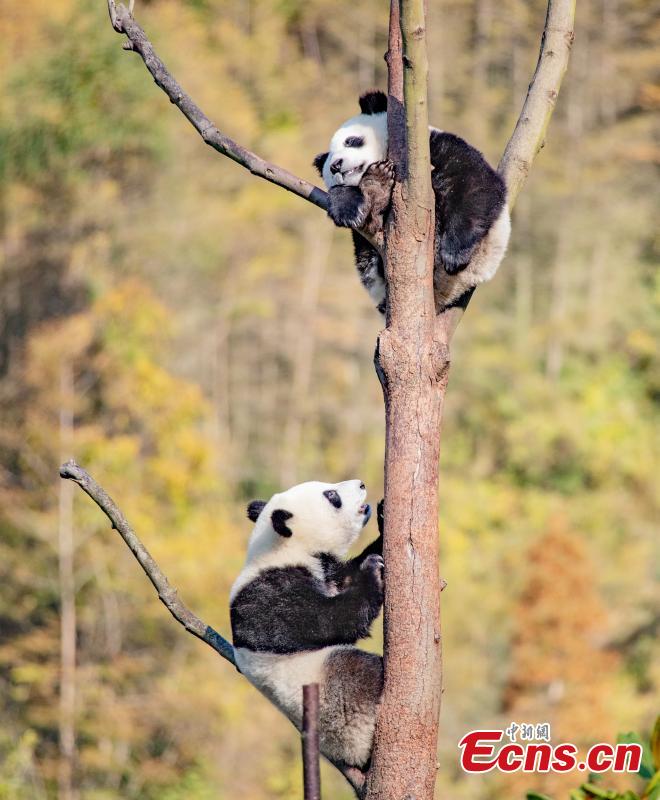 Giant pandas play on a tree at the Research and Conservation Center for Giant Panda in the Wolong Nature Reserve in southwest China's Sichuan Province, October 30, 2019. (Photo/China News Service)