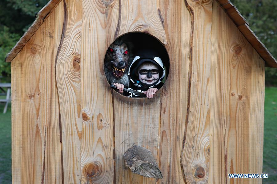 A child poses for photos in front of a Halloween decoration at Pairi Daiza zoo in Brugelette, Belgium, Oct. 31, 2019. A series of activities were held at the zoo to celebrate the Halloween, attracting numbers of locals and tourists. (Xinhua/Zhang Cheng)