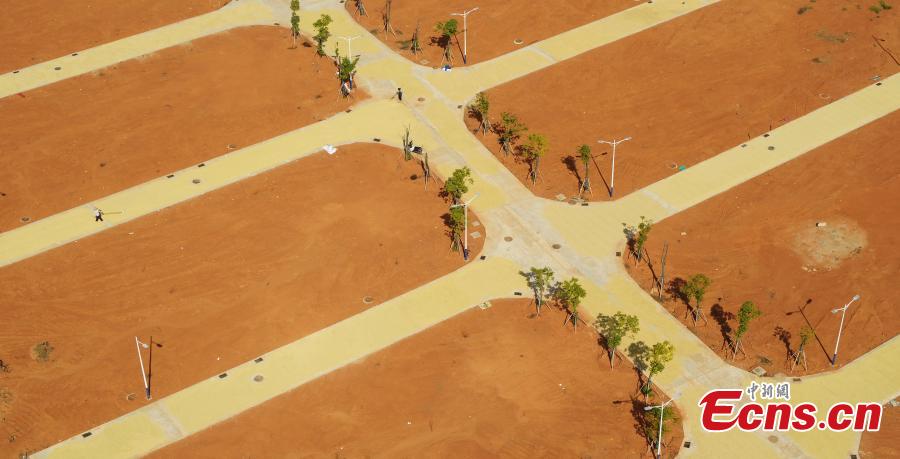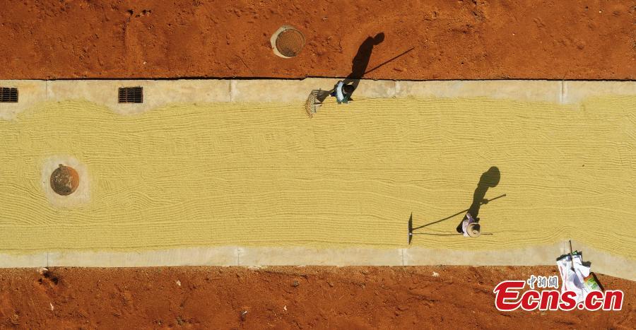 Farmers dry unhulled rice on small roads in Taihe County, East China’s Jiangxi Province, Oct. 31, 2019, forming an unusual contrast to the surrounding red plots. (Photo: China News Service/Deng Heping)