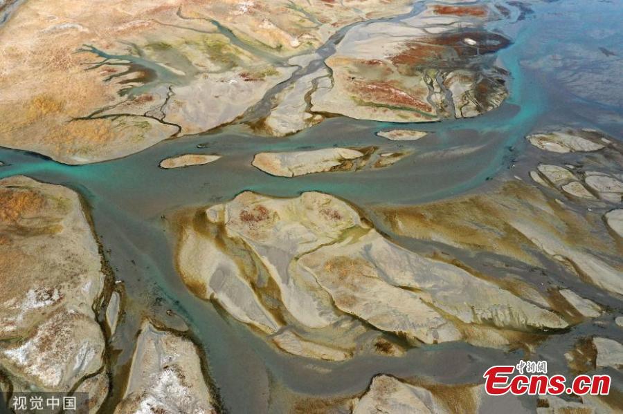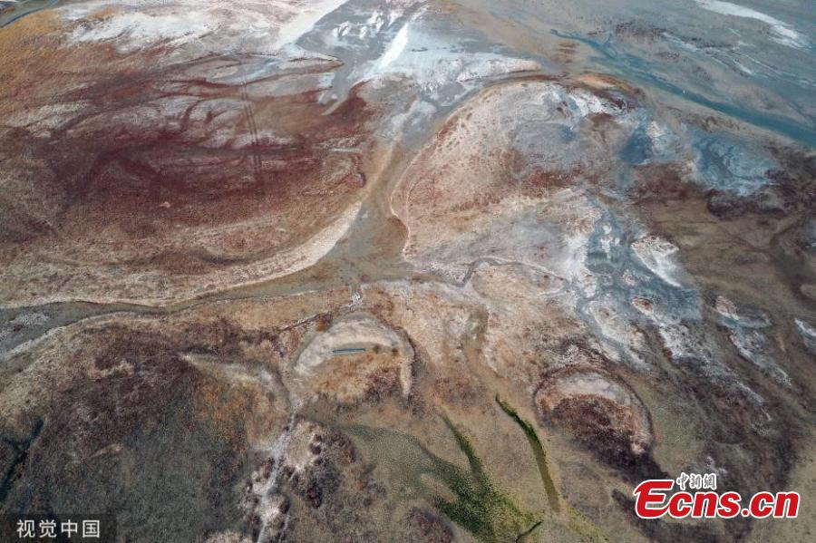 An aerial view of the southern bank of Ebi Lake in Bortala Mongol Autonomous Prefecture, Northwest China’s Xinjiang Uygur Autonomous Region, Nov. 2, 2019. The salt marsh and abundant reeds form a colorful pattern when viewed from the sky. (Photo/VCG)