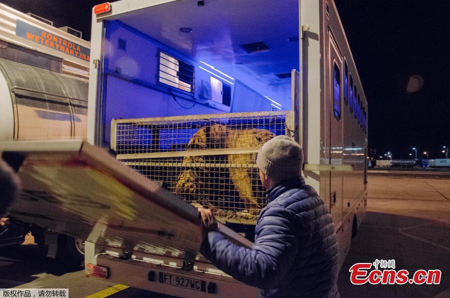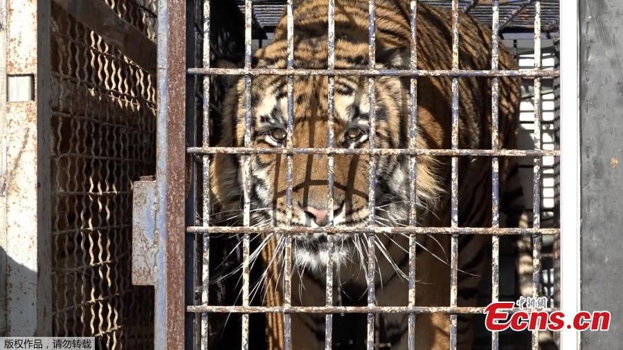 A tiger is pictured in cage on a lorry at the border crossing between Poland and Belarus in Koroszczyn, Poland, October 29, 2019. (Photo/Agencies)