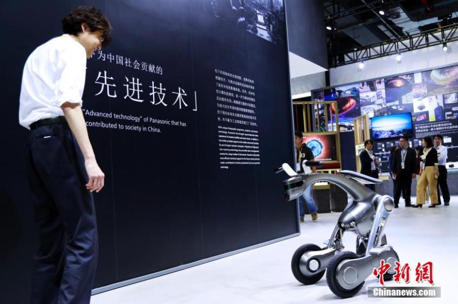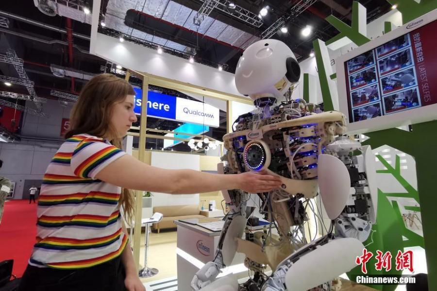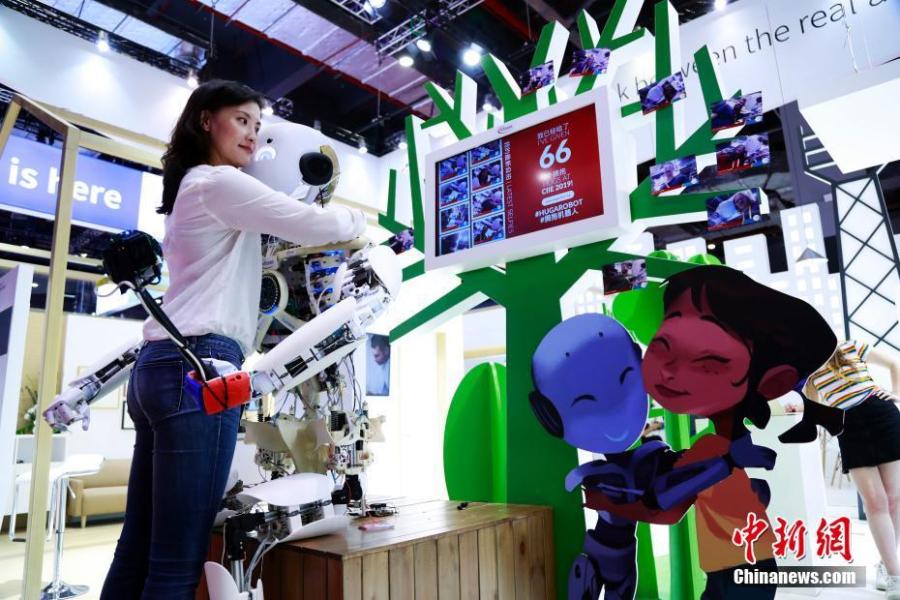 A visitor interacts with a robot on display at the second China International Import Expo in Shanghai, Nov. 4, 2019. (Photo: China News Service/Han Haidan)