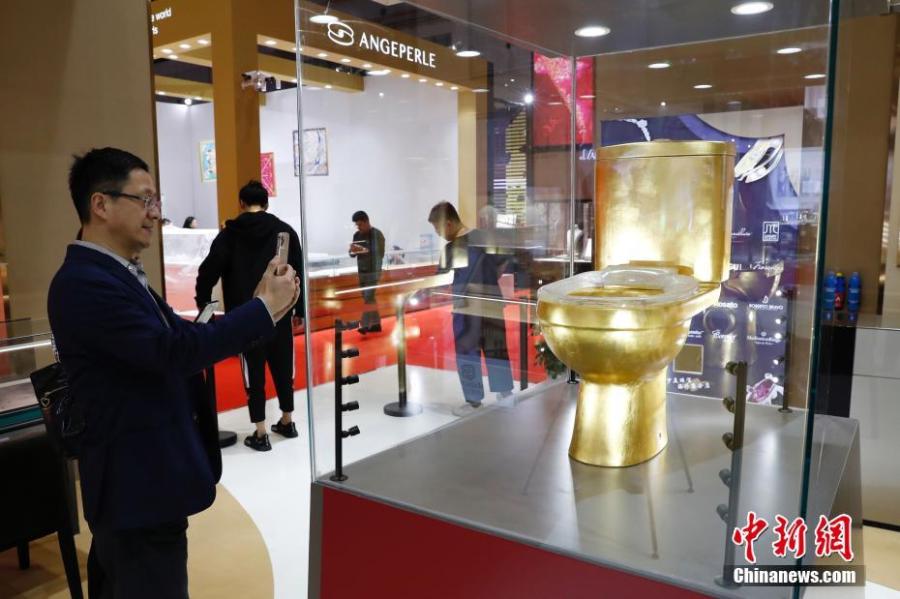 A golden toilet is on display at the second China International Import Expo in Shanghai, Nov. 4, 2019. (Photo: China News Service/Han Haidan)