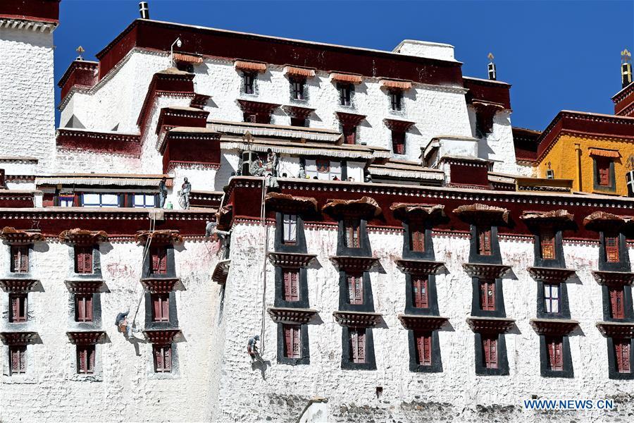 A worker participates in the whitewashing of the exterior of the Potala Palace in Lhasa, southwest China's Tibet Autonomous Region, Nov. 1, 2019. Every year, workers and hundreds of local volunteers gather at the Potala Palace in Lhasa to give the ancient palace a facelift. The 1,300-year-old palace is a landmark of Lhasa. It received 1.45 million tourists in 2017. The palace was included on the UNESCO World Heritage List in 1994. It usually takes about a dozen days to paint the palace in preparation for the forthcoming "Lhabab Duchen," which is believed to be the day the Buddha descended from the heavens and is one of four annual festivals celebrating important events in his life. The palace said it would open to visitors during the facelift. The walls of the palace have four different colors: red, yellow, white and black. The red symbolizes authority, yellow prosperity, white peace, and black exorcism. The locals believe that being part of the work can bring good luck to them and their families. (Xinhua/Chogo)