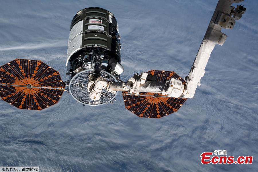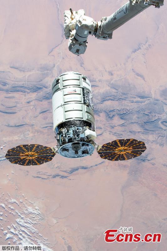 This NASA handout image obtained November 5, 2019 shows the US Cygnus space freighter pictured moments after NASA astronaut Jessica Meir, with fellow Flight Engineer Christina Koch as her back up, commanded the Canadarm2 robotic arm to reach out and grapple the 12th resupply ship from Northrop Grumman on November 4, 2019. The Canadarm2 robotic arm, guided by NASA astronaut Jessica Meir with fellow Flight Engineer Christina Koch as her back up, is poised to capture the 12th resupply ship from Northrop Grumman. (Photo/Agencies)