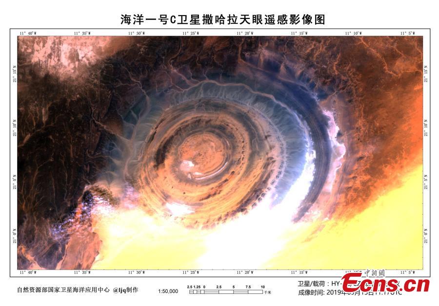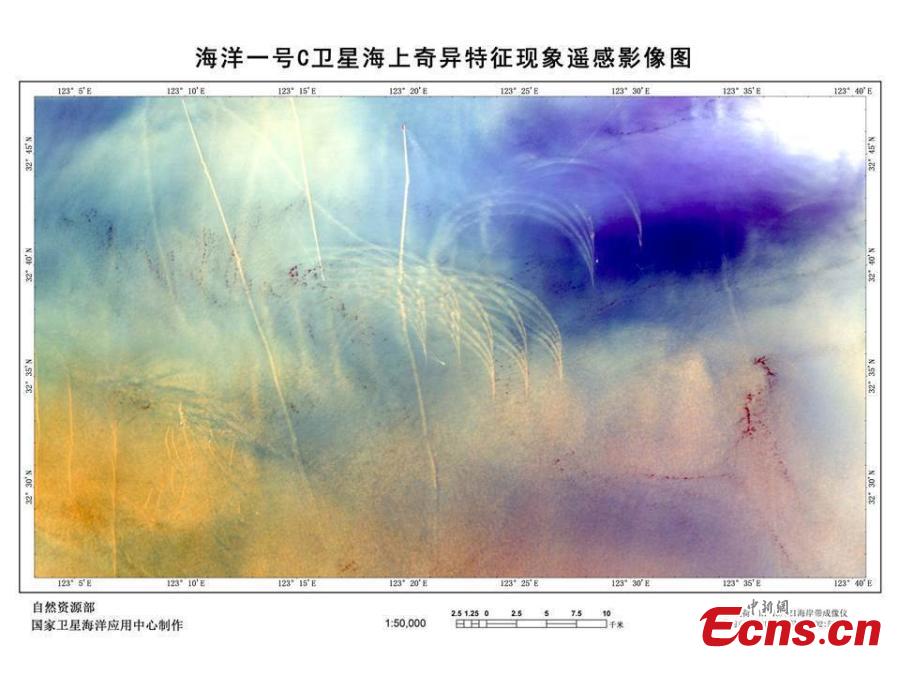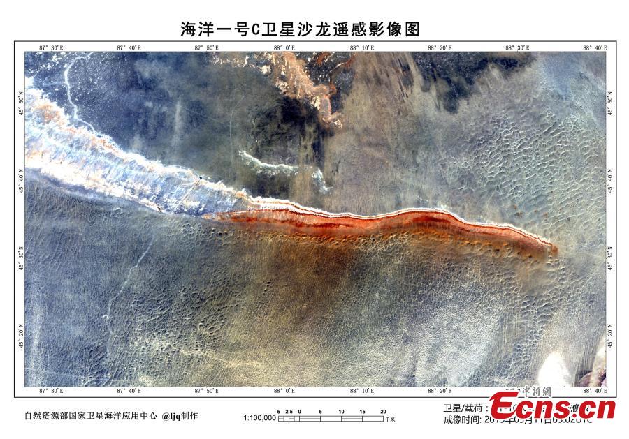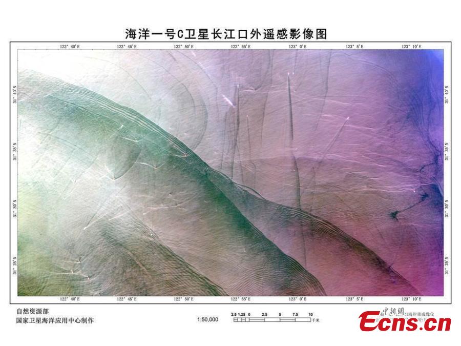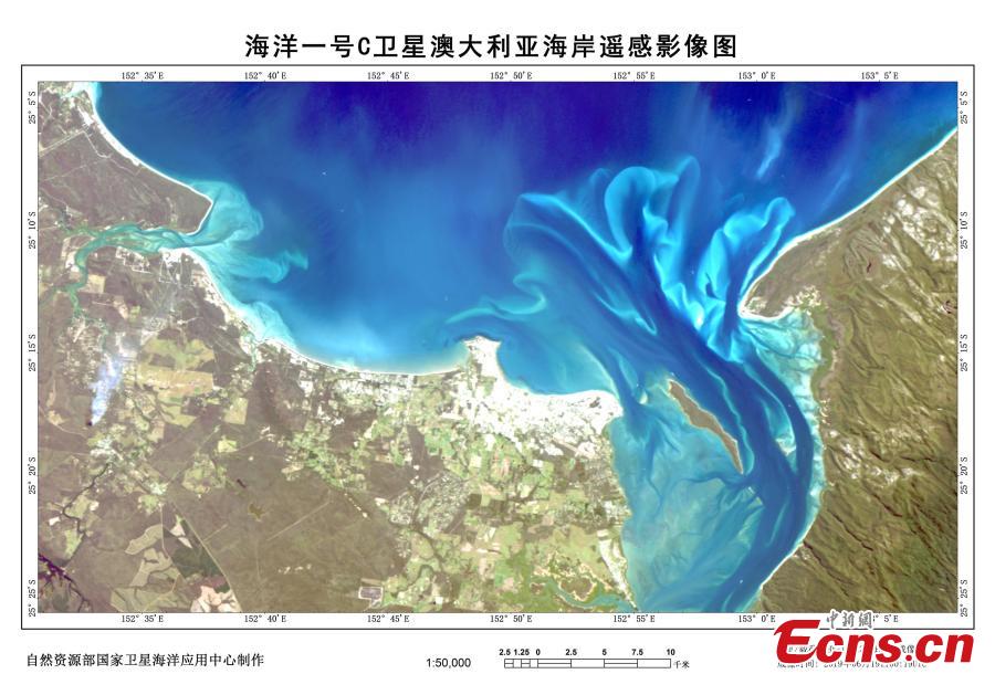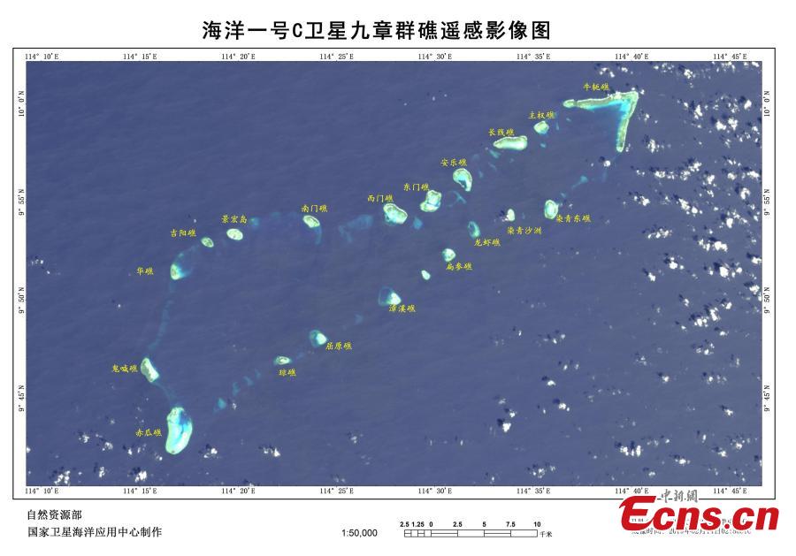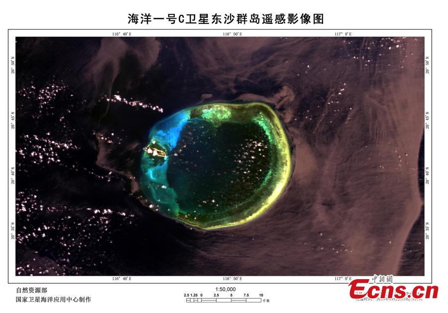 Liu Jianqiang, a researcher with the National Satellite Oceanic Application Center, shows a remote sensing image of Dongsha Islands in the South China Sea, by the Haiyang 1C oceanography satellite during a meeting in Hainan Tropical Ocean University in Sanya City, South China’s Hainan Province. The satellite, launched in Sept. 2018, will assist in monitoring ocean colour and water temperatures, providing basic data for research on the global oceanic environment. (Photo provided to China News Service)