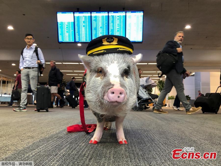 LiLou the therapy pig stands in front of a departures board at San Francisco International Airport in San Francisco, California, U.S. October 4, 2019. (Photo/Agencies)