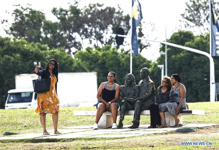 Visitors pose for photos with sculptures of former Brazilian President Juscelino Kubitschek and his wife in front of the Juscelino Kubitschek memorial museum in Brasilia, Brazil, Nov. 8, 2019. The 11th BRICS summit will be held in Brasilia on Nov. 13-14. (Xinhua/Lan Hongguang)