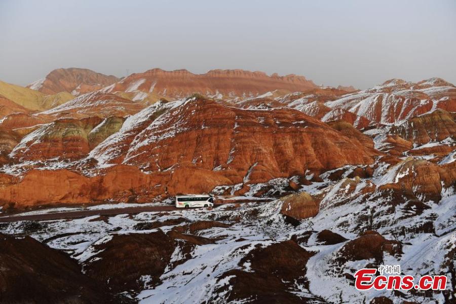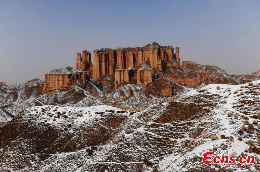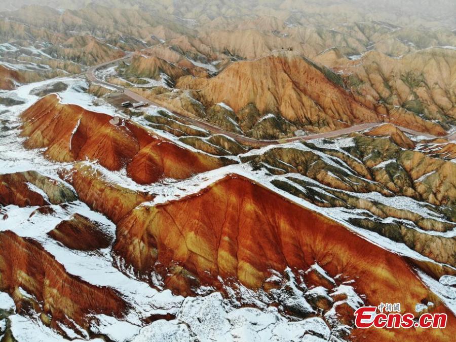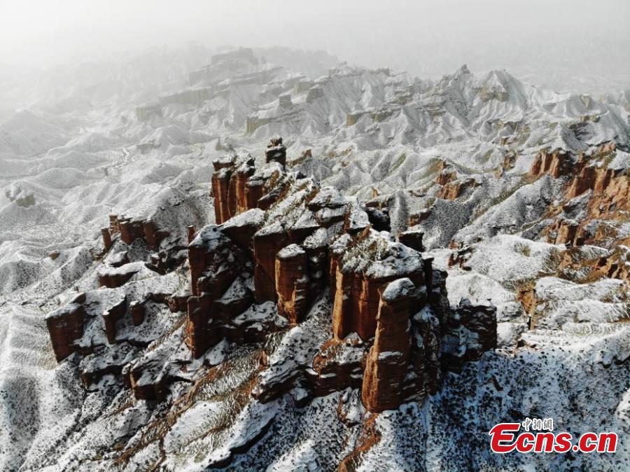 Recent snowfall in mid-November has added incredible charm to the Danxia landforms in Zhangye City, Gansu Province. A unique type of geomorphology, the Danxia landforms are characterized by red-colored sandstone and steep cliffs. (Photo: China News Service/Yang Yanmin)