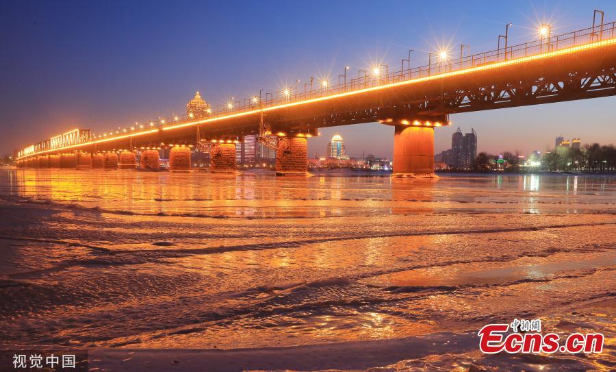 The frozen Songhua River in Harbin City, Heilongjiang Province at sunset on Nov. 20, 2019. The light reflected in the ice created a spectacular view at sunset. (Photo/VCG)