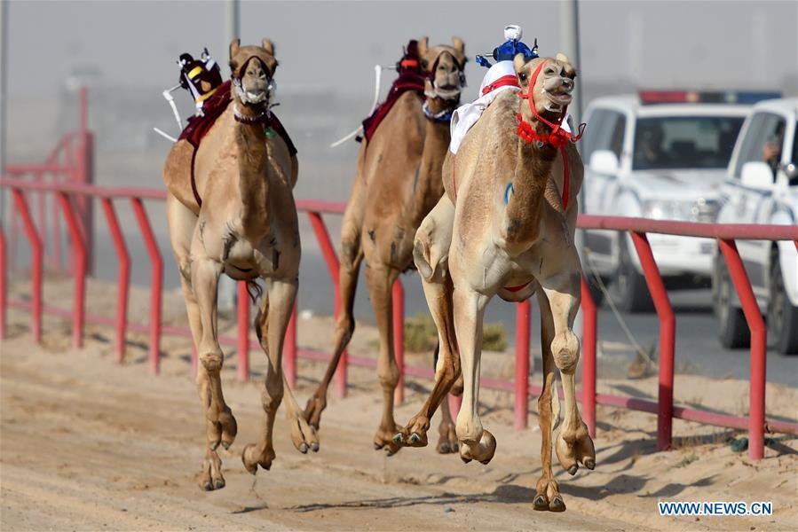 Camels with robot jockeys on their backs compete during the sixth Camel Racing Tournament in Al Ahmadi Governorate, Kuwait, Nov. 20, 2019. (Photo by Ghazy Qaffaf/Xinhua)