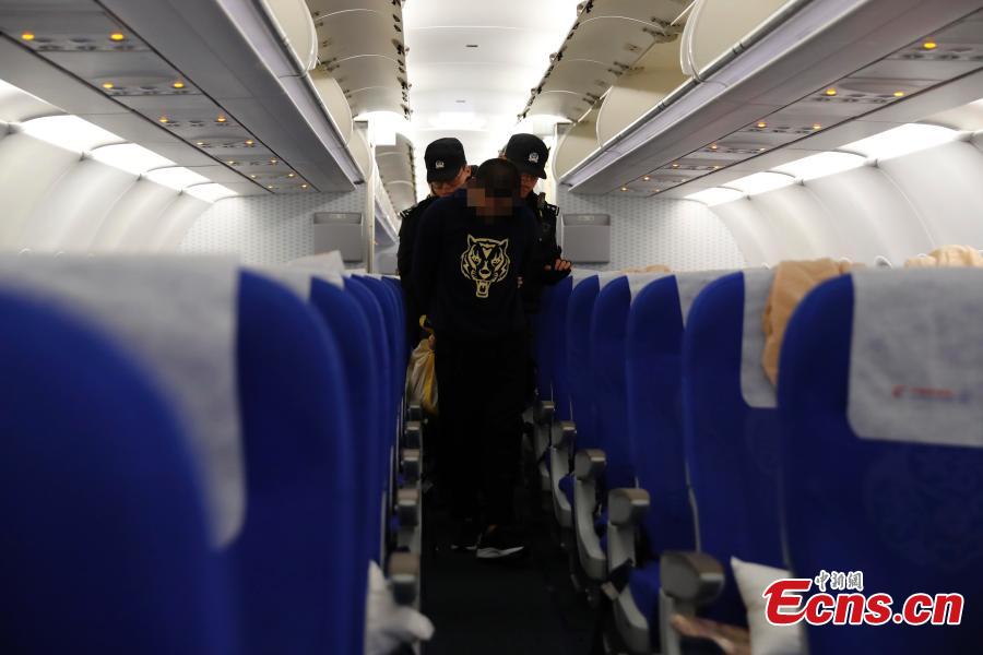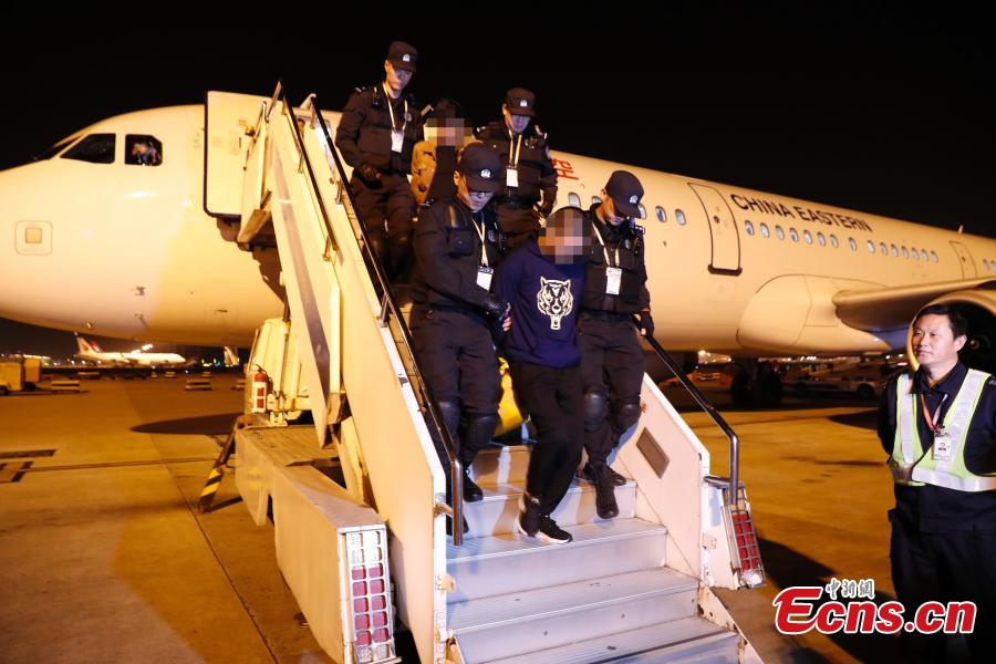 Photo taken on Oct. 31, 2019 shows two suspects in a telecom fraud were arrested by Shanghai police. Police said on Friday 101 suspects were arrested in the fraud case involving over 14 million yuan ($2 million).(Photo: China News Service/Yin Liqin)