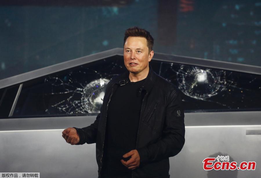 Tesla's new electric pickup truck has secured almost 150,000 orders, the company's chief executive Elon Musk boasted on Twitter, just two days after its big reveal went embarrassingly wrong. The billionaire Tesla co-founder floundered on stage in California on Thursday when the vehicle's armored glass windows cracked in a demonstration intended to prove their indestructible design. Shares in the company plunged 6.1 percent following the truck's bumpy launch and several lackluster reviews. But on Saturday Musk tweeted that Tesla had already received 146,000 orders from prospective owners. (Photo/Agencies)