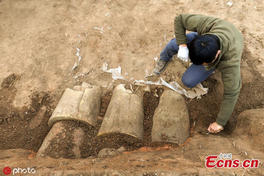 Excavation at the Langyatai ruins in Qingdao City, East China’s Shandong Province. China's National Cultural Heritage Administration has approved excavation at the ruins that date back to the Qin (221- 206 BCE) and subsequent Han (202 BCE- 220 CE) dynasties. Archaeologists have discovered remains of pottery pipelines that look like a modern drainage system. (Photo/ICphoto)