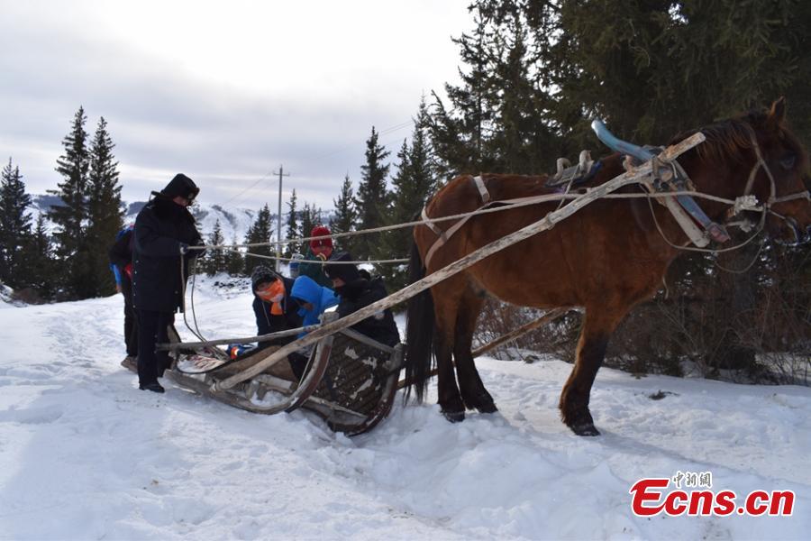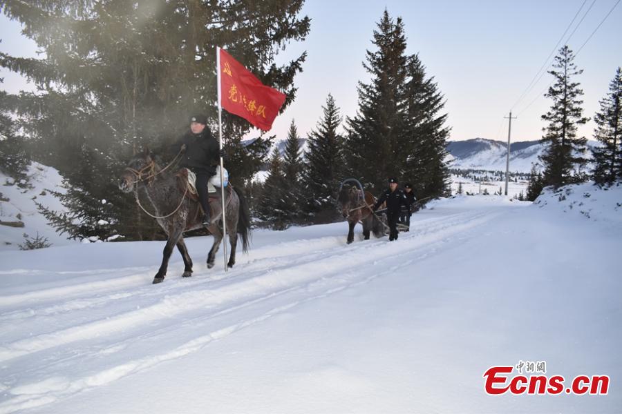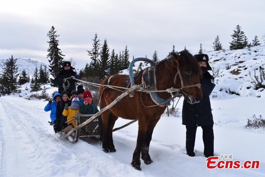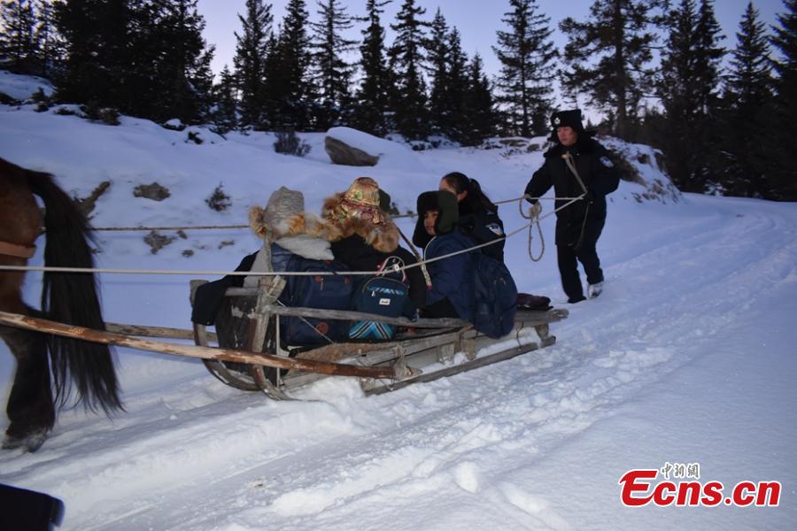 Border police use a horse-drawn sleigh to transport children to and from school in Asantai Village in Altay City, Northwest China’s Xinjiang Uygur Autonomous Region, after snowfall and temperatures as low as minus 20 degrees cut off the road on Nov. 23 and 24. (Photo: China News Service/ Wang Youbo)