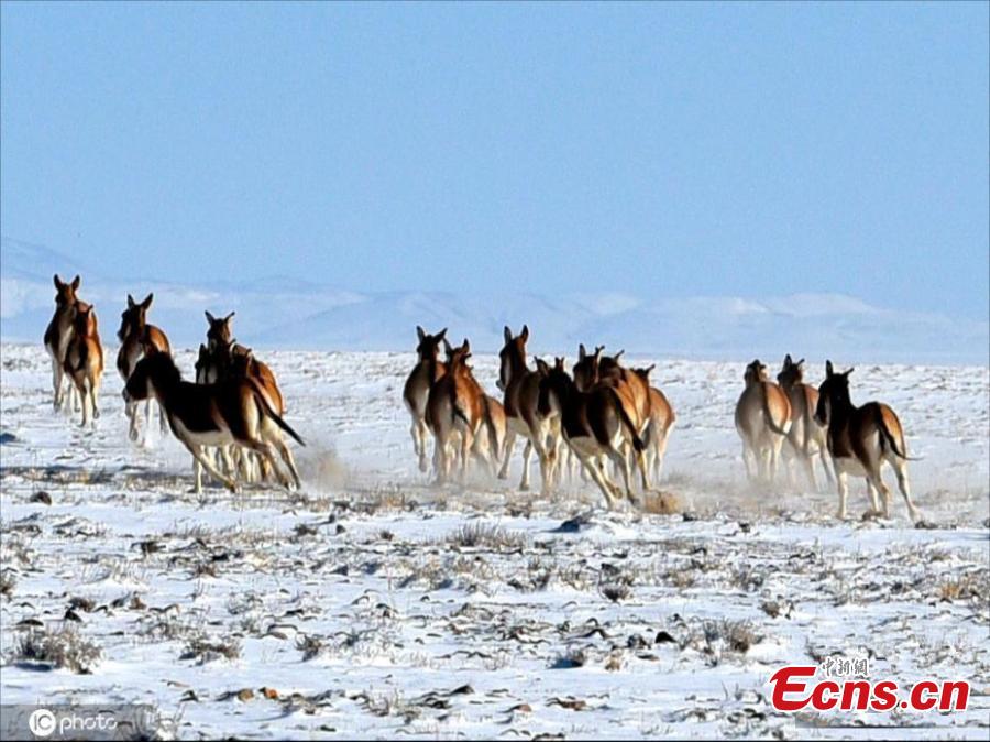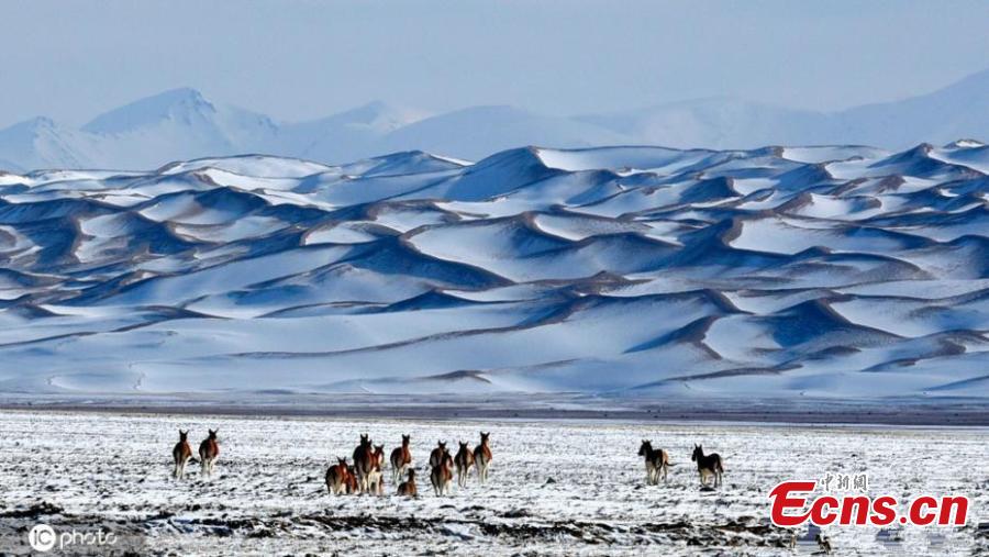 Galloping kiangs (Equus kiang) are seen in the Altun Mountains National Nature Reserve in northwest China's Xinjiang Uygur Autonomous Region, November 26, 2019. (Photo/ICphoto)