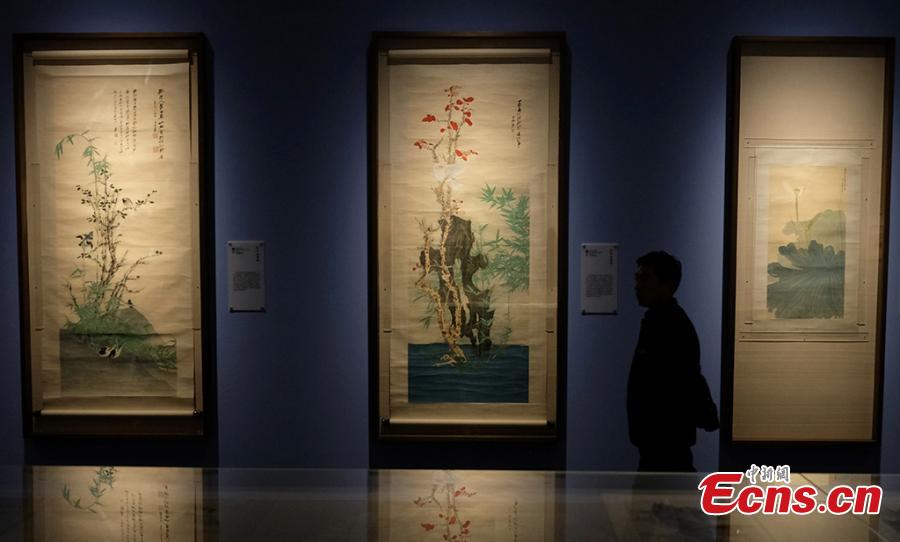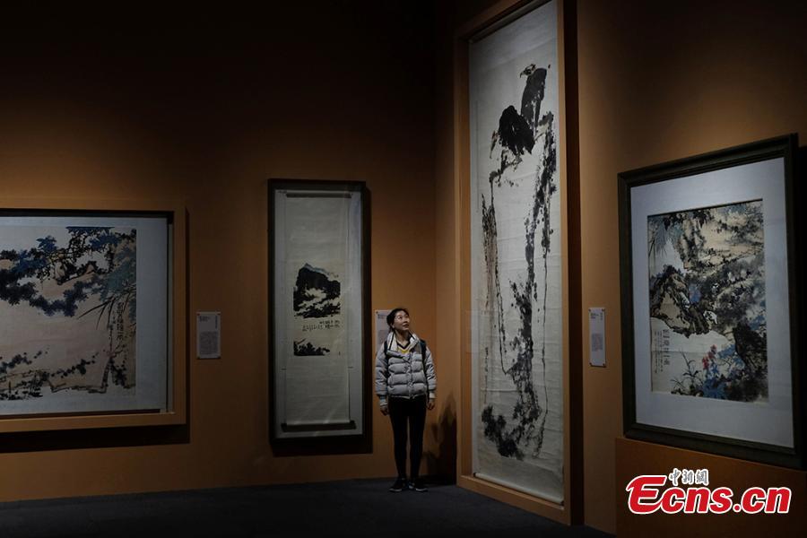 Nanjing Museum hosts a unique exhibition of 158 Chinese paintings by eight masters of the 20th century including Qi Baishi, Huang Binhong, Xu Beihong, Pan Tianshou, Zhang Daqian, Lin Fengmian, Fu Baoshi and Li Keran. The exhibition also showcased the brushes, seals and other items related to the painting masters, attracting many tourists. (Photo: China News Service/ Yang Bo)