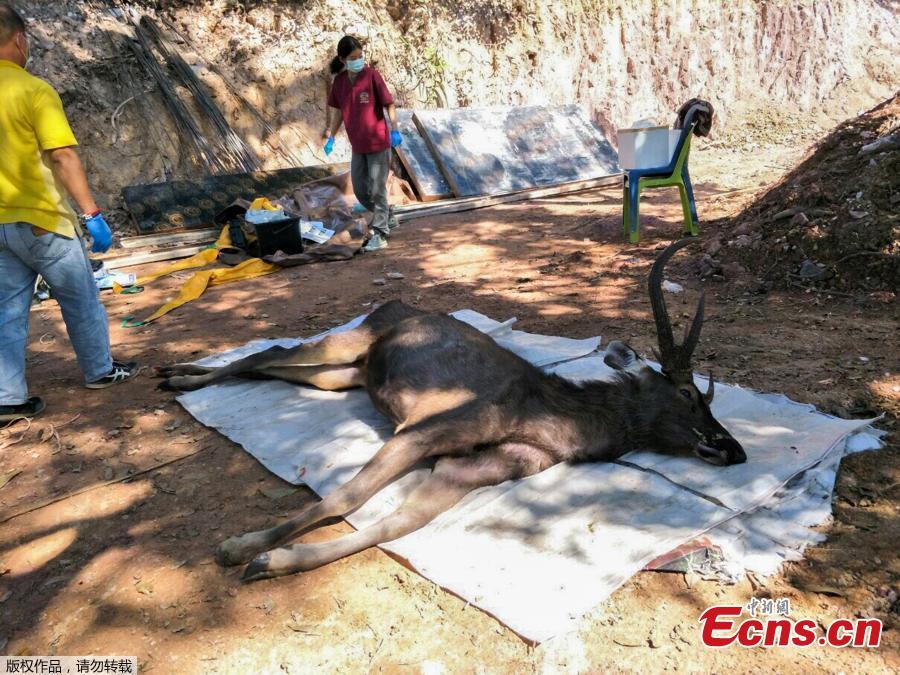 In this photo released by the Office of Protected Area Region 13 on November 26, 2019 and taken on November 25, veterinarians prepare to examine a dead deer at Khun Sathan National Park in Thailand's Nan province. A wild deer was found dead after swallowing 7 kilograms of plastic bags and other trash in Thailand, an official said November 26, raising the alarm on waste littering the country's waters and forests. (Photo/Agencies)