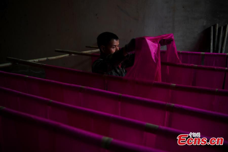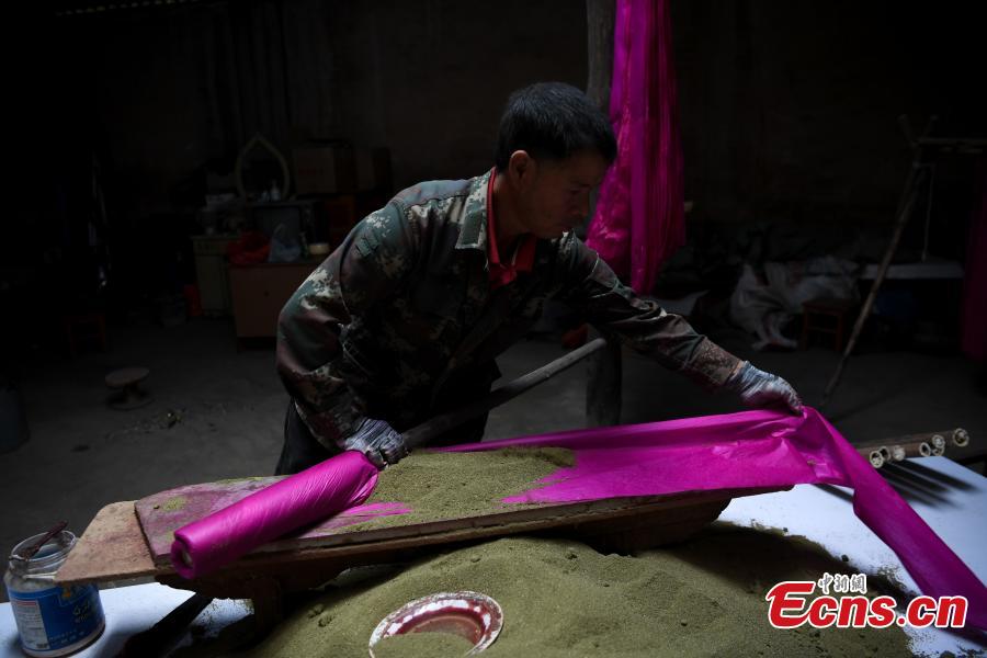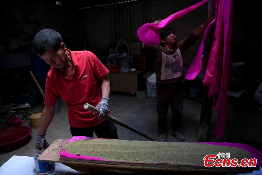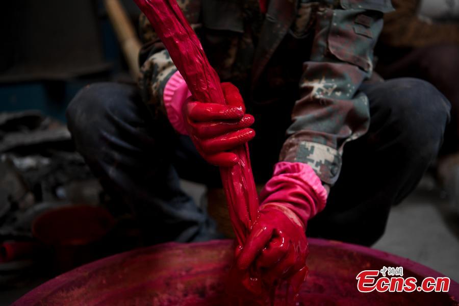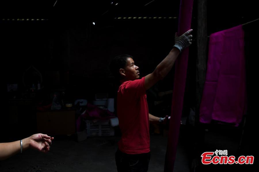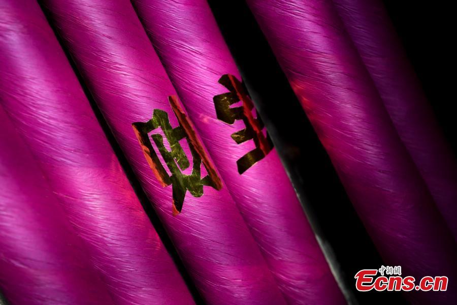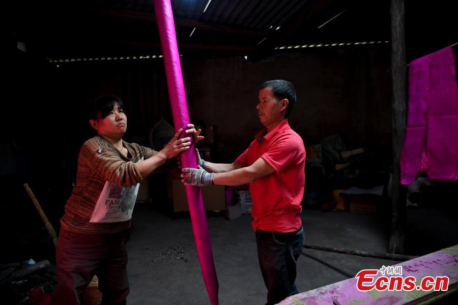 Shi Shangcai and his wife make large joss sticks, up to 1.2 meters long, in Hexi Town, Tonghai County, Southwest China’s Yunnan Province, Nov. 28, 2019. The couple has worked in the trade for 20 years andis known locally for their handmade joss sticks often used at traditional festivals. (Photo provided to China News Service)
