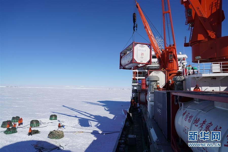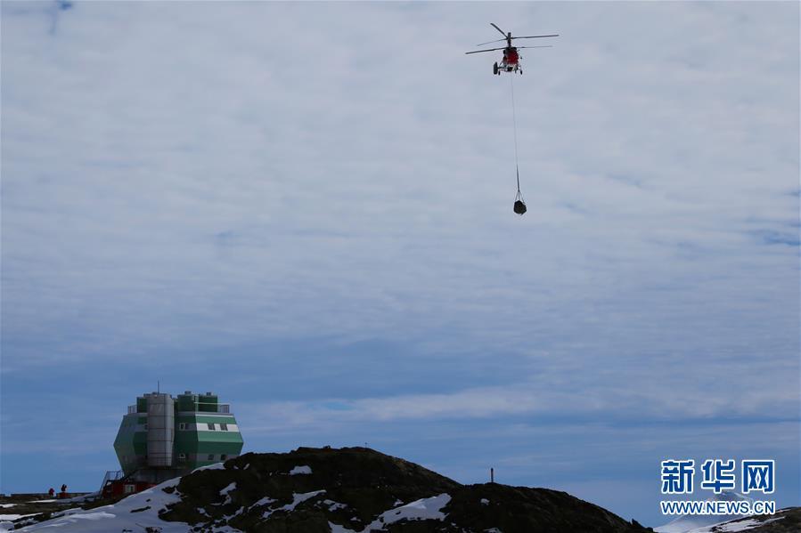 A helicopter unloads cargo from China's polar icebreaker Xuelong in Antarctica on December 1, 2019. China's polar icebreakers Xuelong and Xuelong 2 on November 27, 2019 reached the waters near the Zhongshan Station in Antarctica. (Photo/Xinhua)