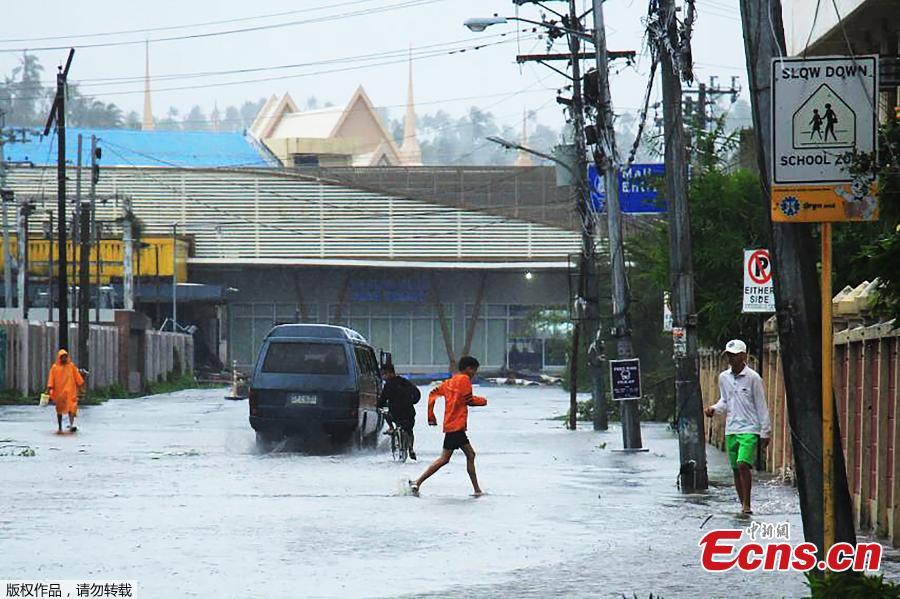 A child (C) wades through a flooded road following the passage of Typhoon Kammuri in Legaspi City, Albay province, south of Manila on December 3, 2019. Typhoon Kammuri lashed the Philippines with fierce winds and heavy rain, as hundreds of thousands took refuge in shelters and the capital Manila prepared to shut down its international airport over safety concerns. (Photo/Agencies)