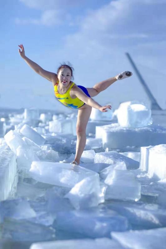 Yu Xiaofeng poses for a photo as she kicks her legs in the freezing Songhua River. Recently the temperature dropped to as low as -20 C in Harbin, capital of Northeast China's Heilongjiang province. (Photo provided to chinadaily.com.cn)