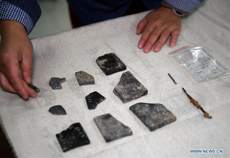 Photo taken on Dec. 3, 2019 shows the debris of stone armor discovered in the Qindu District of Xianyang, northwest China's Shaanxi Province. A production site of stone armor of the Qinshihuang mausoleum was found in a protection area in the Qindu District of Xianyang, with limestone unearthed that have the same characteristics as the stone armor of the mausoleum of the Emperor Qinshihuang of the Qin Dynasty (221 BC-207 BC), the Shaanxi Provincial Institute of Archaeology said Wednesday. (Xinhua/Li Yibo)