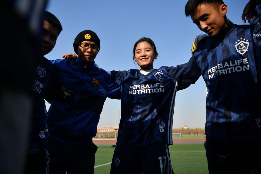 On a football field in Tianjin, a petite Tibetan girl playing in a boy's team received a cross from a teammate, controled it and sent the ball flying into the net.