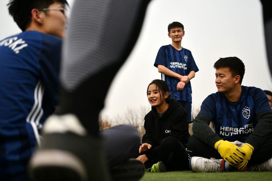 Pubu Droma, a 18-year-old Tibetan girl, sits among her male teammates between training sessions of the men's football team at Nankai University on Nov. 29, 2019. (Xinhua/Li Ran)