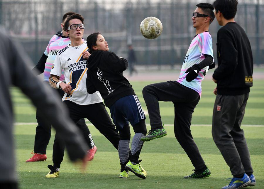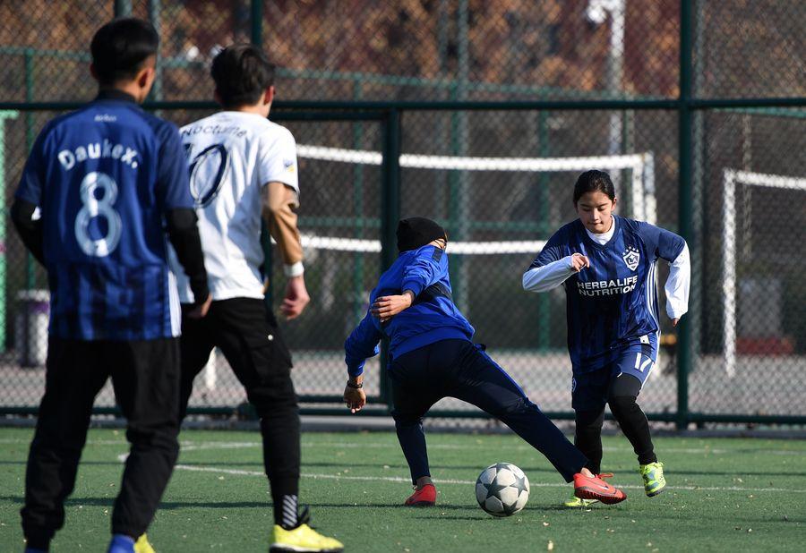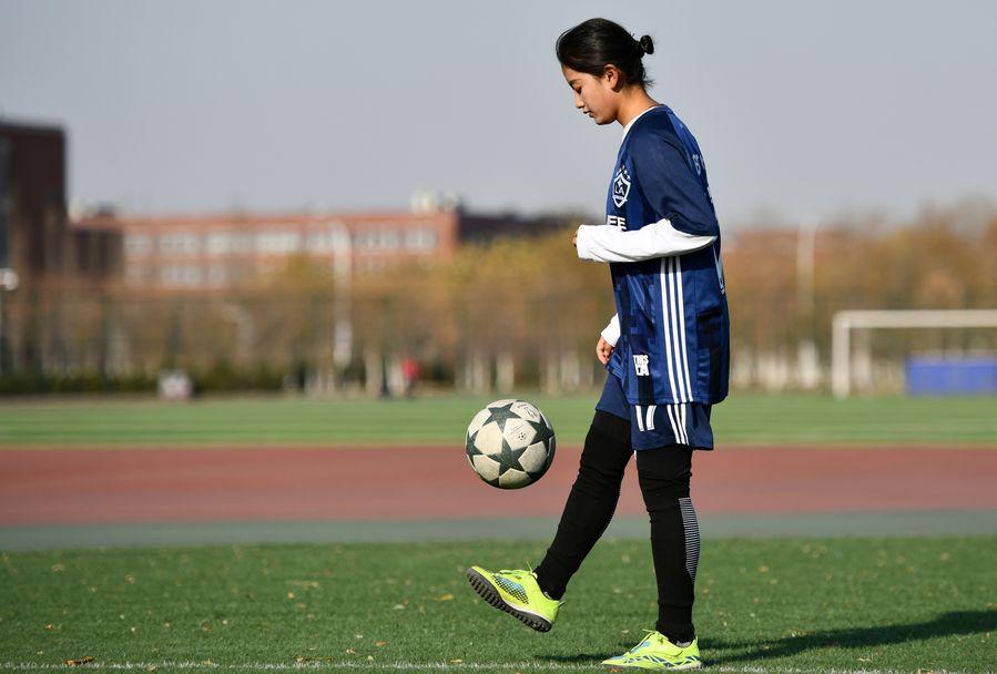 Pubu Droma plays on the pitch at Nankai University on Nov. 28, 2019. (Xinhua/Li Ran)