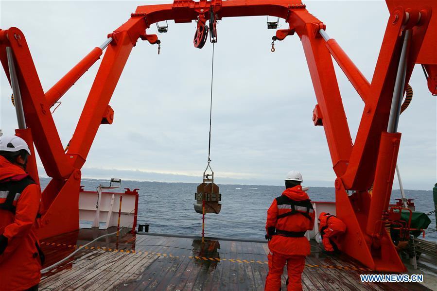 Team members of China's 36th Antarctic expedition work on China's polar icebreaker Xuelong 2 in the Cosmonauts sea, Dec. 8, 2019. This is the first time for China's Antarctic expedition members to explore the Cosmonauts sea. (Xinhua/Liu Shiping)