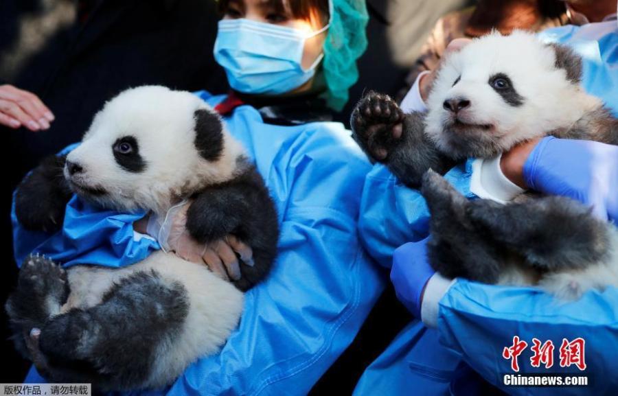 The first-ever twin panda cubs born in Germany-in Berlin Zoo-were named Meng Xiang and Meng Yuan after they turned 100 days old on Monday. The twins, both male, were born on Aug. 31 to six-year-old Meng Meng and her partner Jiao Qing, sent by China to Germany in 2017. At a press conference held in Berlin Zoo with the two cubs wheeled out in a glass-cased "panda bed", Chinese Ambassador to Germany Wu Ken said that, put together, the two names meant "beautiful dreams come true." He said the names for the panda cubs were chosen to "convey our best wishes for the friendship between our two countries and two peoples." (Photo/Agencies)