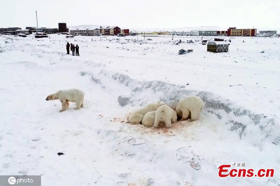 Dozens of polar bears have crowded a village in Russia's far east in search for food, forcing public events to be canceled and humans to shelter inside. About 60 polar bears descended on Ryrkaypiy in Russia's remote Chukotka region, Tatyana Minenko, the head of the village's "bear patrol" told Russian state news agency RIA Novosti. The polar bears are eating the carcasses of walruses that have remained on the village's shores since the fall, the Russian branch of the World Wide Fund for Nature (WWF) said Thursday in a statement. (Photo/ICphoto)