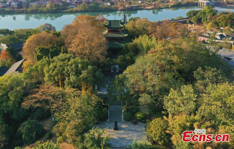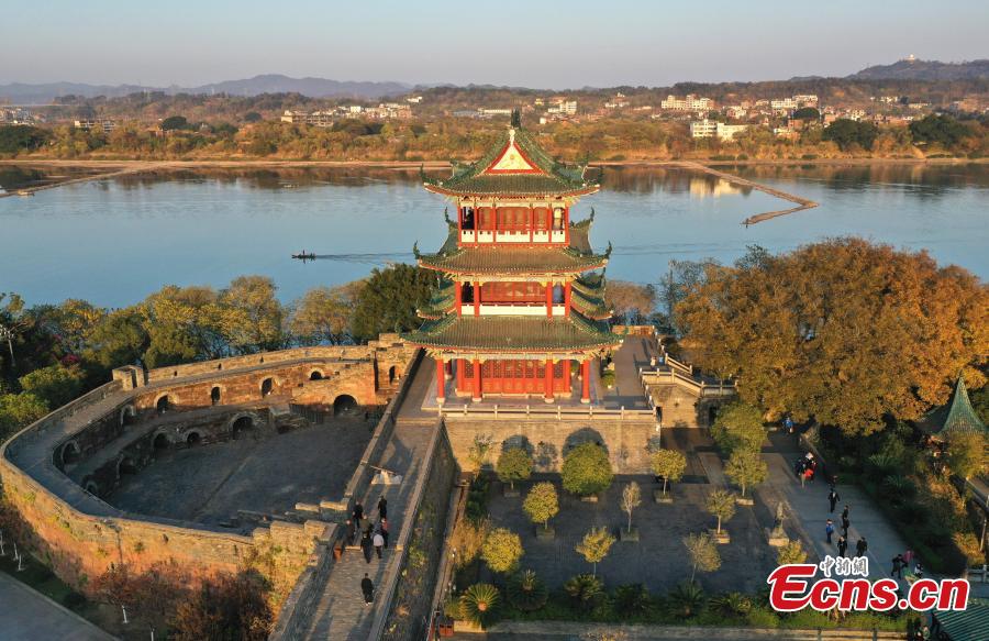 The aerial photo taken on December 12, 2019 shows Yugu Pavilion and Bajing Pavilion on ancient city wall in Ganzhou, East China’s Jiangxi province. Built during the Han dynasty (202 BC-220 AD), the wall is now over 3,000 meters long after renovation and reinforcement. (Photo: China News Service/ Liu Zhankun)