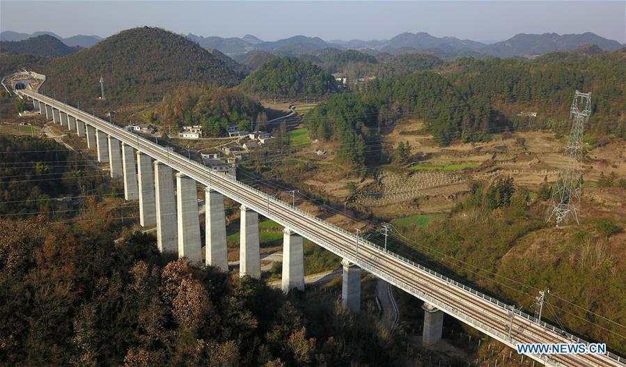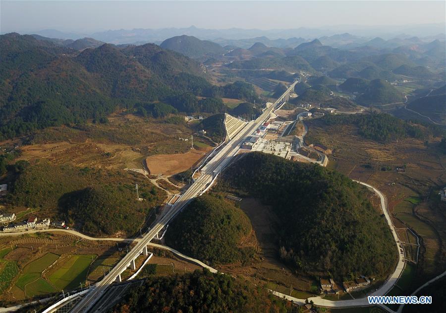 Aerial photo shows the Chengdu-Guiyang railway in Qingzhen in southwest China's Guizhou Province, Dec. 15, 2019. The 650-kilometer railway, an important part of the country's high-speed rail network, is expected to be in operation on Dec. 16. (Xinhua/Yang Wenbin)