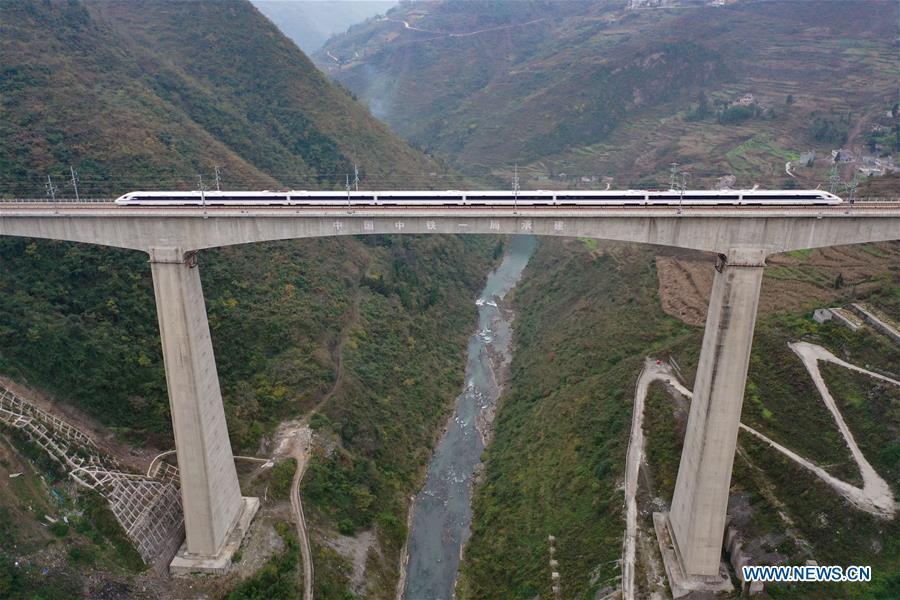A train runs on Xiangbahe grand bridge during a trial operation of Chengdu-Guiyang railway in southwest China's Guizhou Province, Dec. 3, 2019. The 650-kilometer railway, an important part of the country's high-speed rail network, is expected to be in operation on Dec. 16. (Xinhua/Liu Xu)