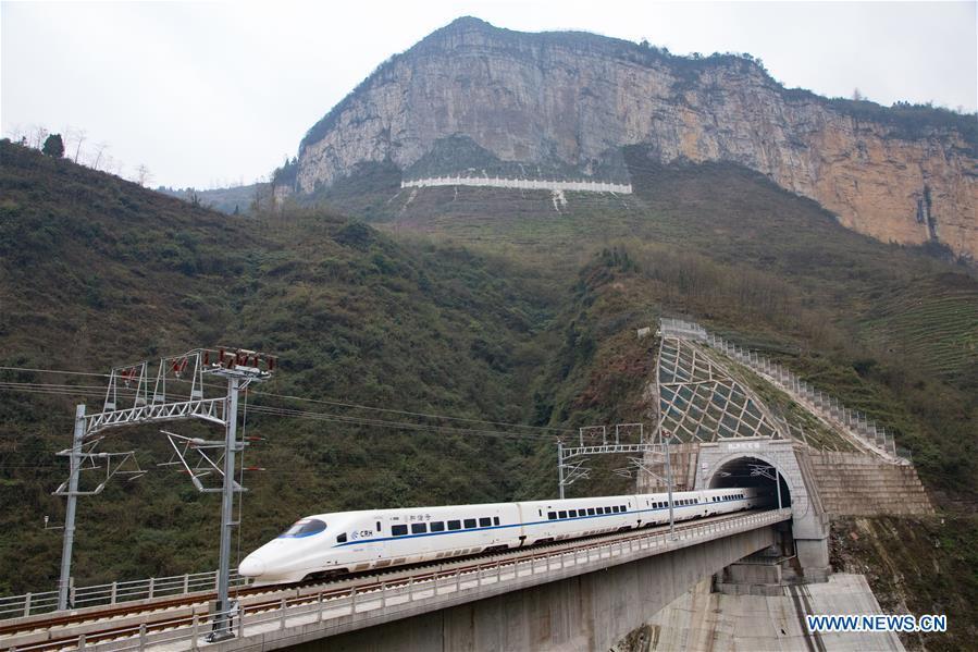 A train runs in a trial operation of Chengdu-Guiyang railway in southwest China's Guizhou Province, Dec. 3, 2019. The 650-kilometer railway, an important part of the country's high-speed rail network, is expected to be in operation on Dec. 16. (Xinhua/Liu Xu)