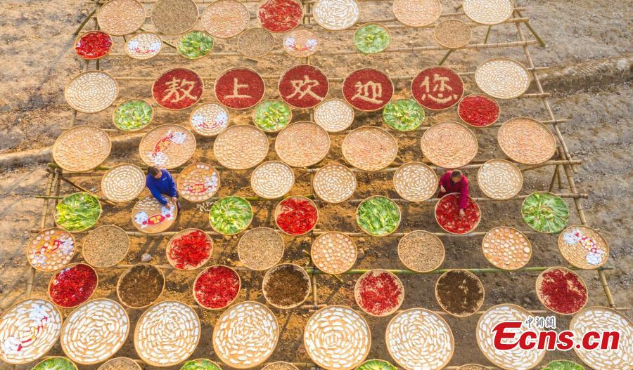 A villager sun-dries red chilli in a village, Ji’an city, Jiangxi province, December 15, 2019. In "shaidong", a time-honored practice of the village in winter, farmers put agricultural produce such as corn and chili peppers in bamboo baskets to sun-dry them. The variety of colors on the ground adds to the pleasure of the cold season. (Photo: China News Service/ Li Xiaoming)