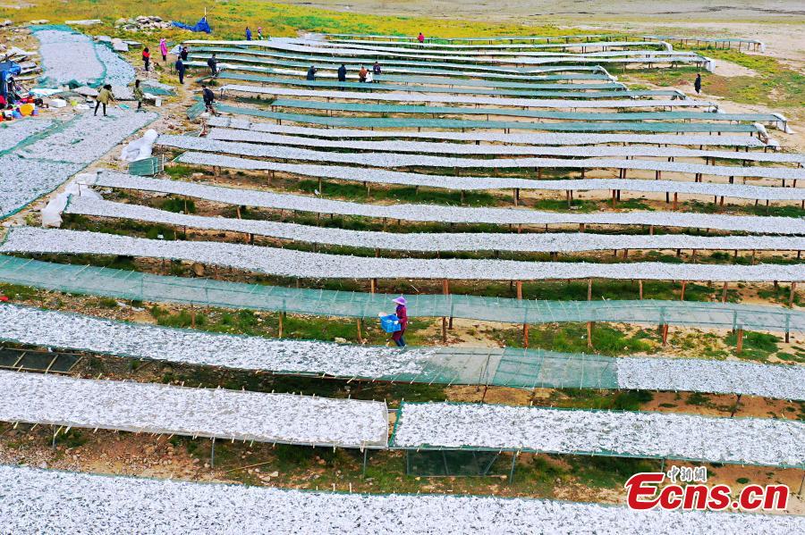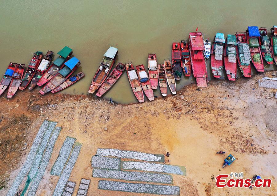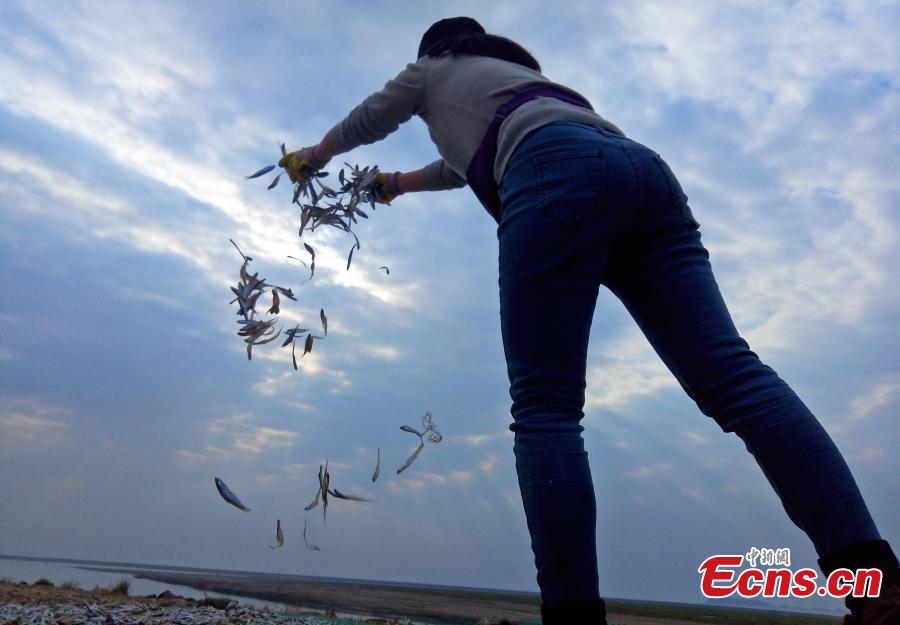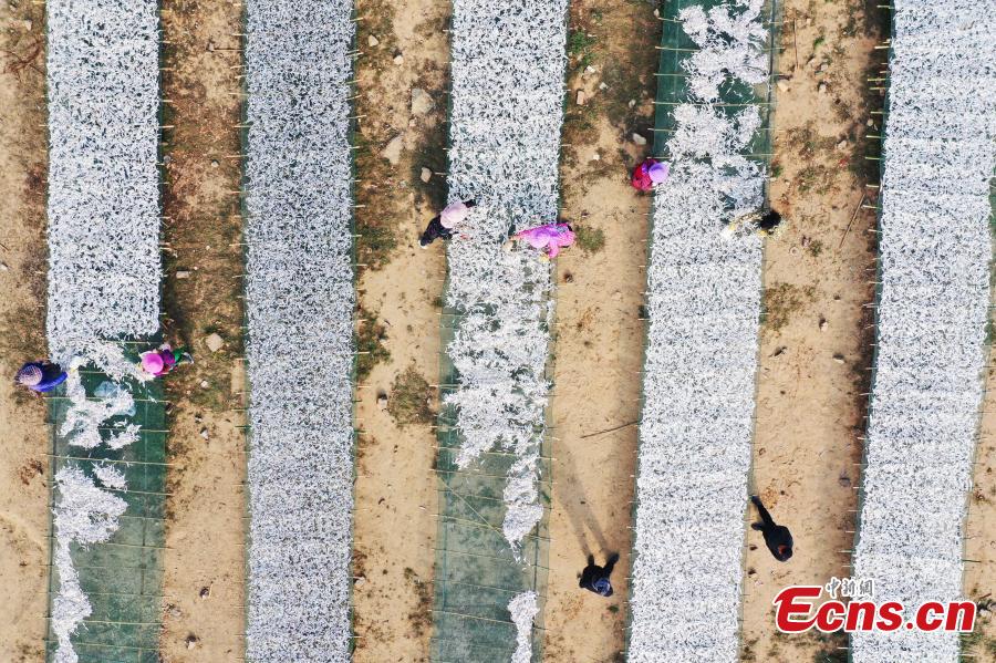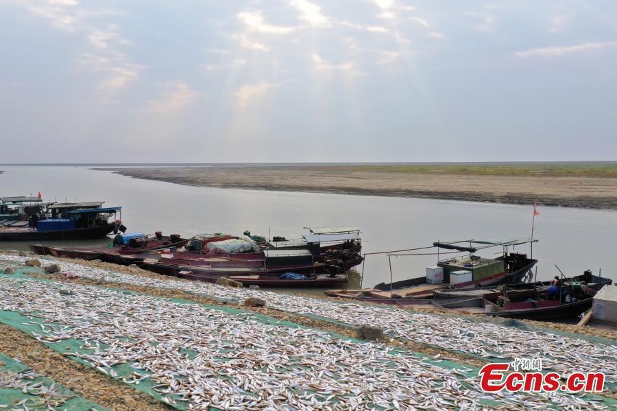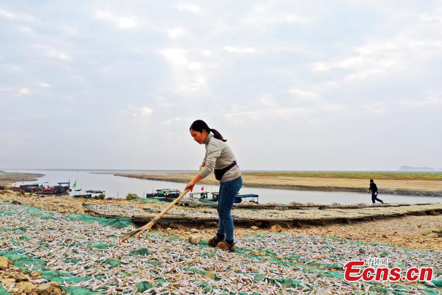 Fish farmers dry lake anchovies by the side of Poyang Lake near the Yinshan Island in Duchang County, east China's Jiangxi Province, December 16, 2019 . Local fish farmers make the fish into air-dried products for sale on the winter market. (Photo: China News Service/ Liu Zhankun)