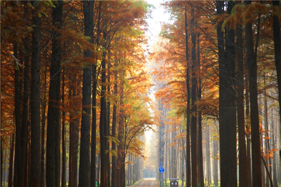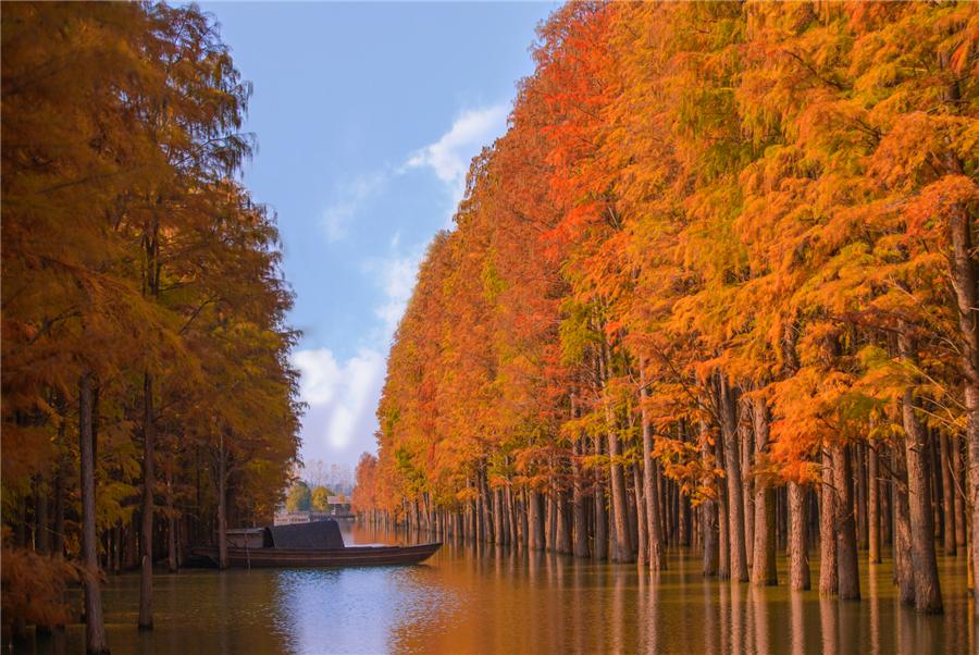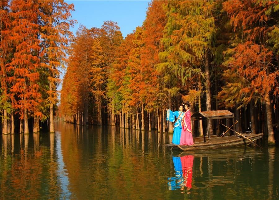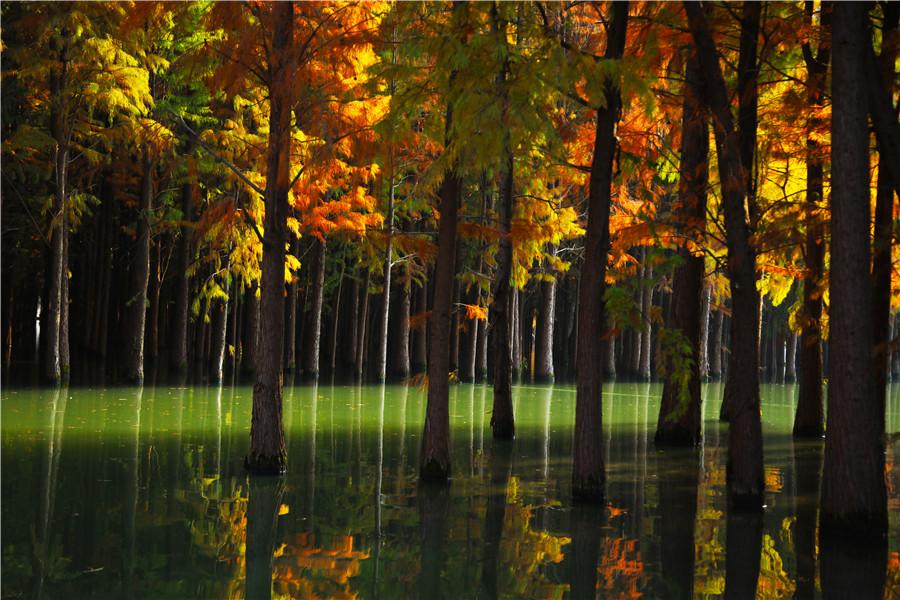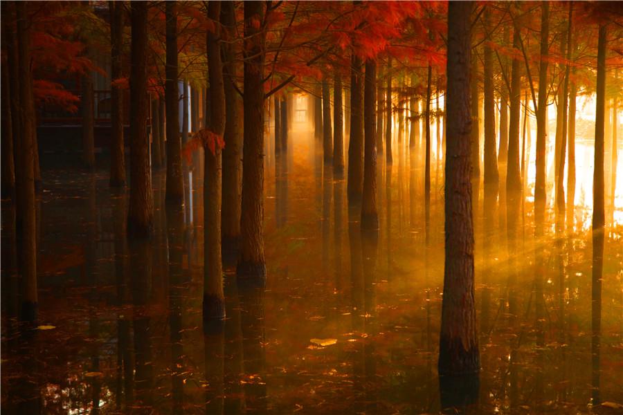 Dawn redwood trees that turned bright red and orange drew visitors to a cultural and tourist destination in Xiantao, Hubei Province. The area represents a distinctive environment with trees growing in water, birds nestling in trees and fish swimming in lakes.