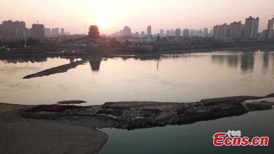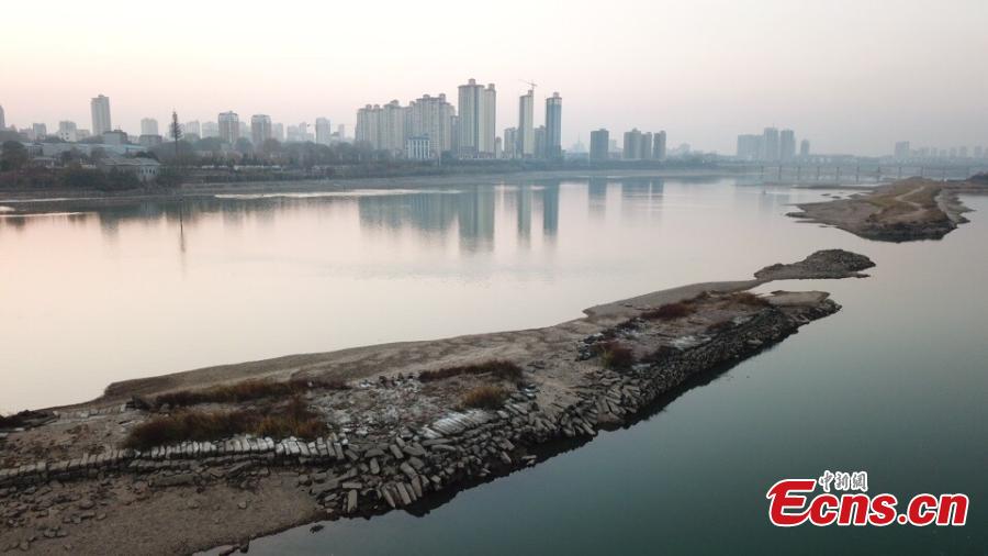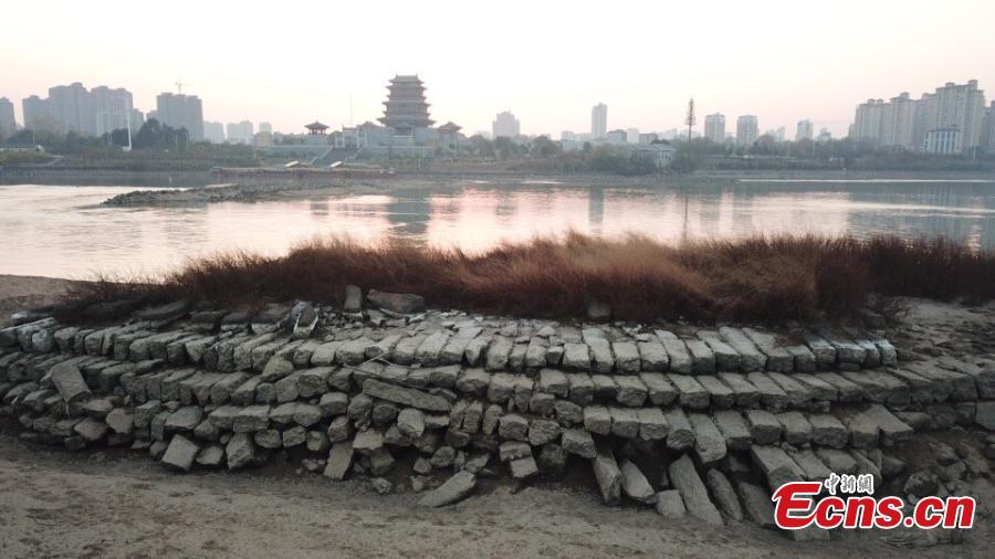 Base part of ancient Qianjinbei Irrigation System, which is normally submerged in river, now shows up due to low water level in Fucheng city, East China’s Jiangxi province. The Qianjinbei Irrigation System, located in the city of Fuzhou, dates back more than 1,200 years. It is a large water conservancy project in the middle reaches of the Yangtze River, which has multiple functions including irrigation, transportation, drainage and flood control. The irrigation project was declared World Heritage Irrigation Structures in September this year. (Photo: China News Service/Chen Yuanmao)