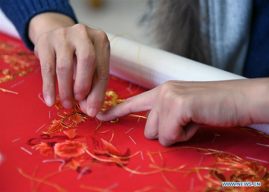 Yu Jing, a Beijing embroidery artist, does embroidery on a fabric at her workshop in Beijing, capital of China, Dec. 11, 2019. Yu Jing, who has been making Beijing embroidery since 2004, established a Beijing embroidery workshop with some of her artist friends two years ago, hoping to add some modern elements to this traditional Chinese craft. Beijing embroidery, also known as Imperial embroidery, is known as one of the eight exquisite handicrafts of Beijing. (Xinhua/Ren Chao)