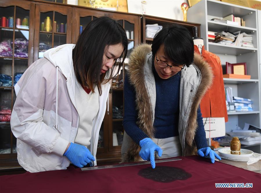 Yu Jing(R), a Beijing embroidery artist, prints the embroidery pattern on a fabric at her workshop in Beijing, capital of China, Dec. 11, 2019. Yu Jing, who has been making Beijing embroidery since 2004, established a Beijing embroidery workshop with some of her artist friends two years ago, hoping to add some modern elements to this traditional Chinese craft. Beijing embroidery, also known as Imperial embroidery, is known as one of the eight exquisite handicrafts of Beijing. (Xinhua/Ren Chao)