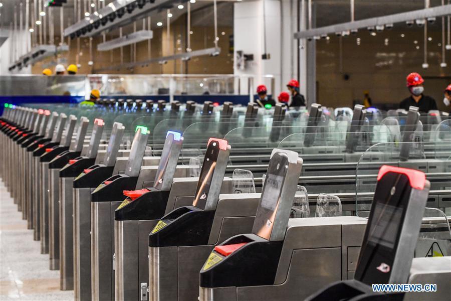 Technical workers test turnstiles at the new Hengqin port in Zhuhai, south China's Guangdong Province, Dec. 10, 2019. After three years of construction, the new Hengqin port is ready for visitors to travel between Zhuhai and the Lotus port in Macao. (Xinhua/Lu Ye)
