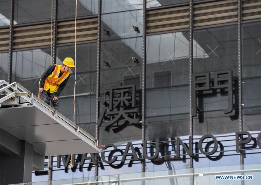A worker builds the new Hengqin port in Zhuhai, south China's Guangdong Province, Dec. 10, 2019. After three years of construction, the new Hengqin port is ready for visitors to travel between Zhuhai and the Lotus port in Macao. (Xinhua/Liu Dawei)