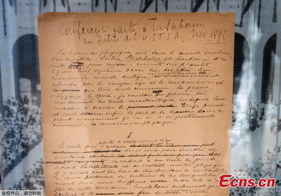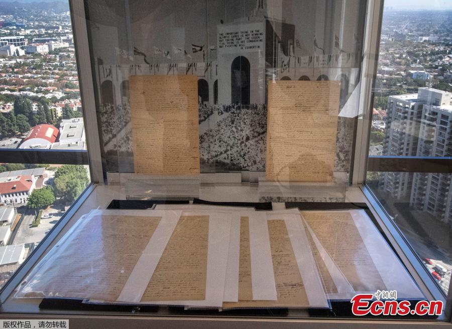 The original Olympic Games manifesto, written in 1892 by French aristocrat, educator and athletics advocate Pierre de Coubertin which outlines his vision for reviving the ancient Olympic Games as a modern, international athletic competition, on public display at Sotheby's in Century City, California, on October 23, 2019. The manifesto will be auctioned on December 18 at Sotheby's in New York. (Photo/Agencies)
