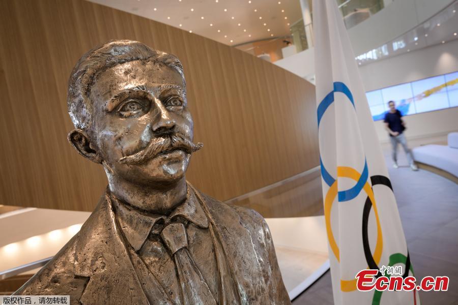 A picture taken on June 18, 2019 in Lausanne shows a statue of International Olympic Committee (IOC) founder Pierre de Coubertin at the entrance of the new IOC headquarters that will be inaugurated on June 23, 2019. (Photo/Agencies)
