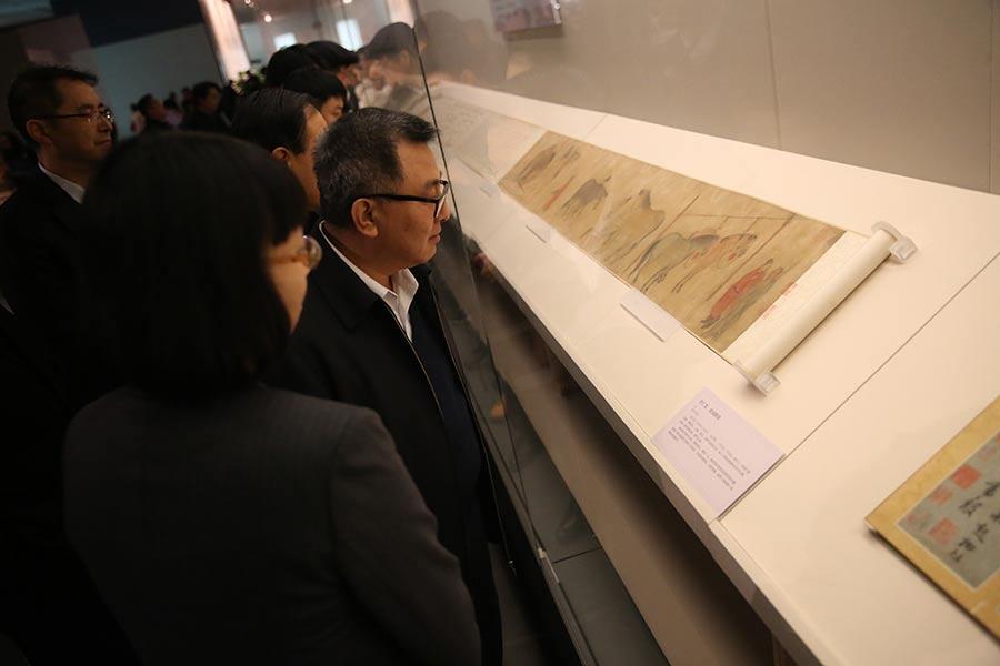 Wang Chunfa, director of National Museum of China, looks at a painting by Yuan artist Ren Renfa on show. (Photo provided to China Daily)